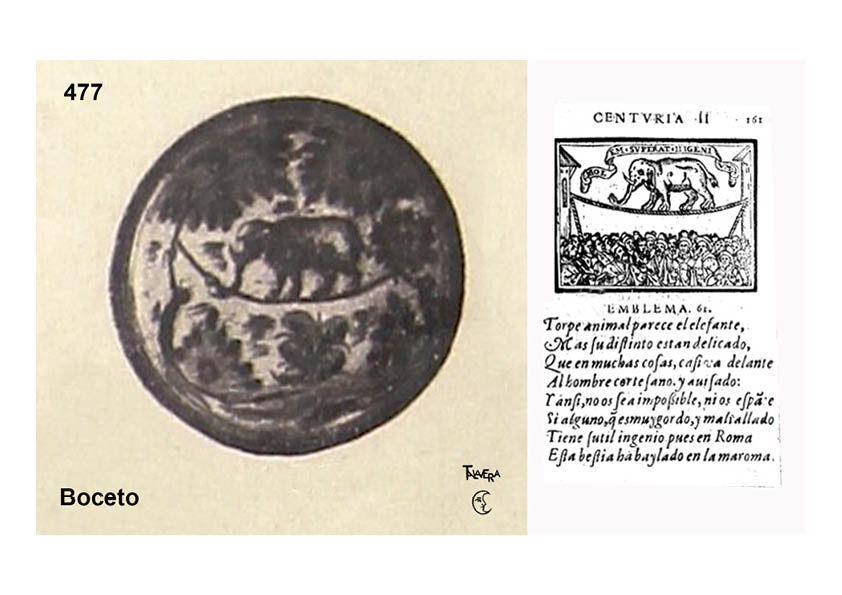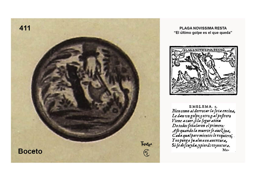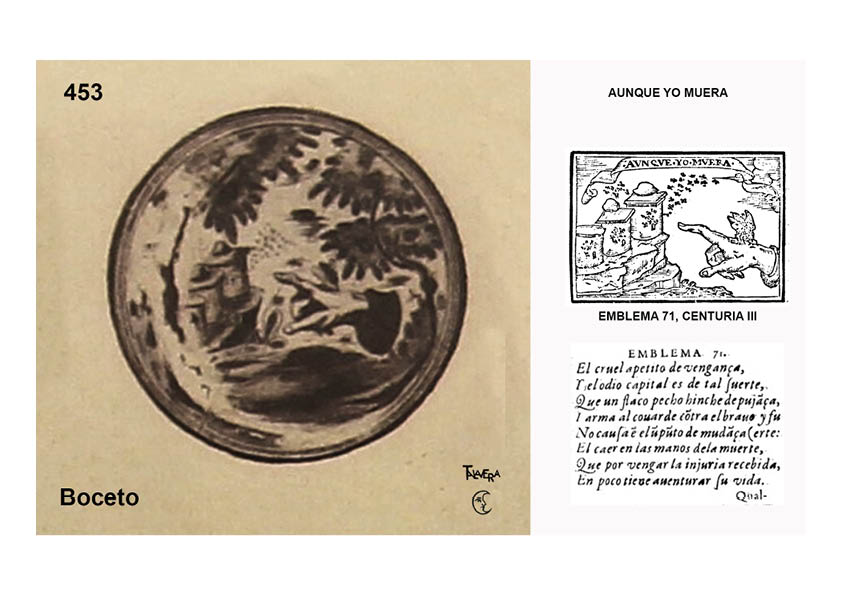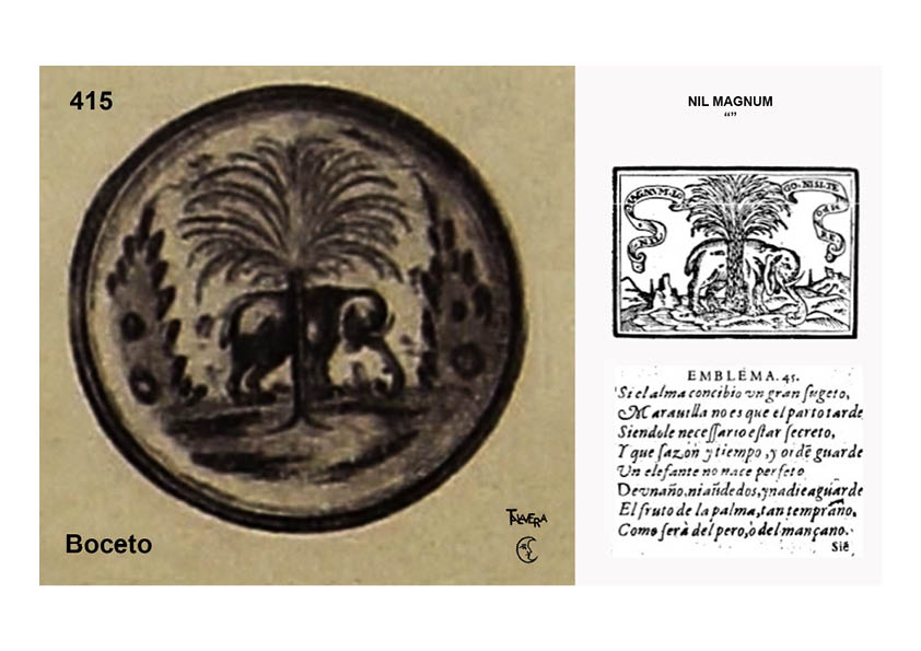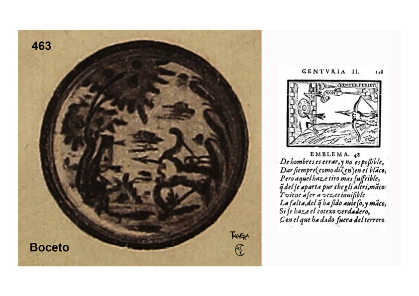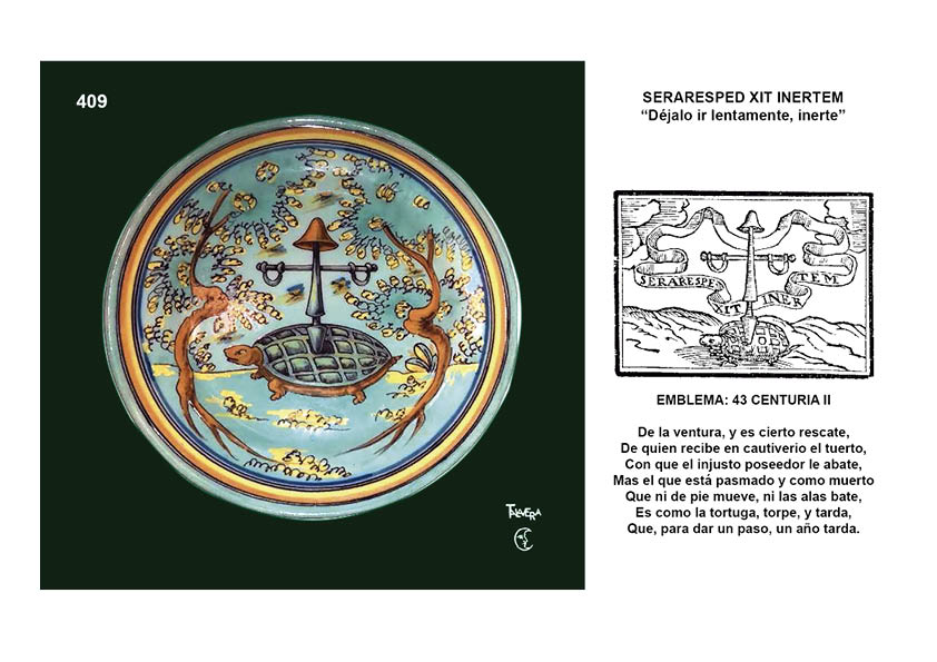 Este otro plato, catalogado con el número 409 del 2º catálogo de Ruiz de Luna (1915), recrea el Emblema 43 de la CENTURIA II del libro «Los Emblemas Morales de Sebastián de Covarrubias»