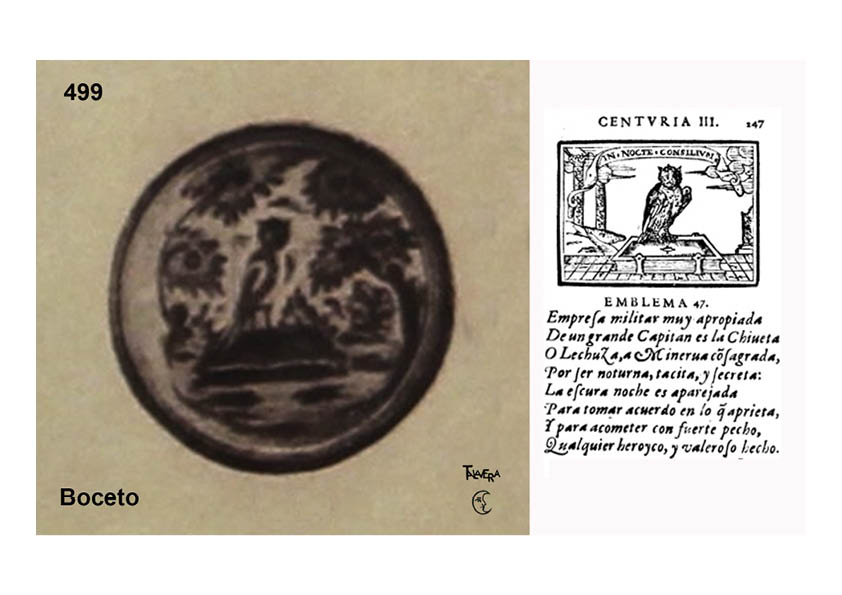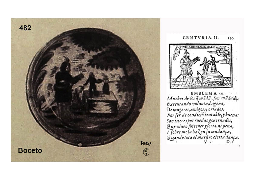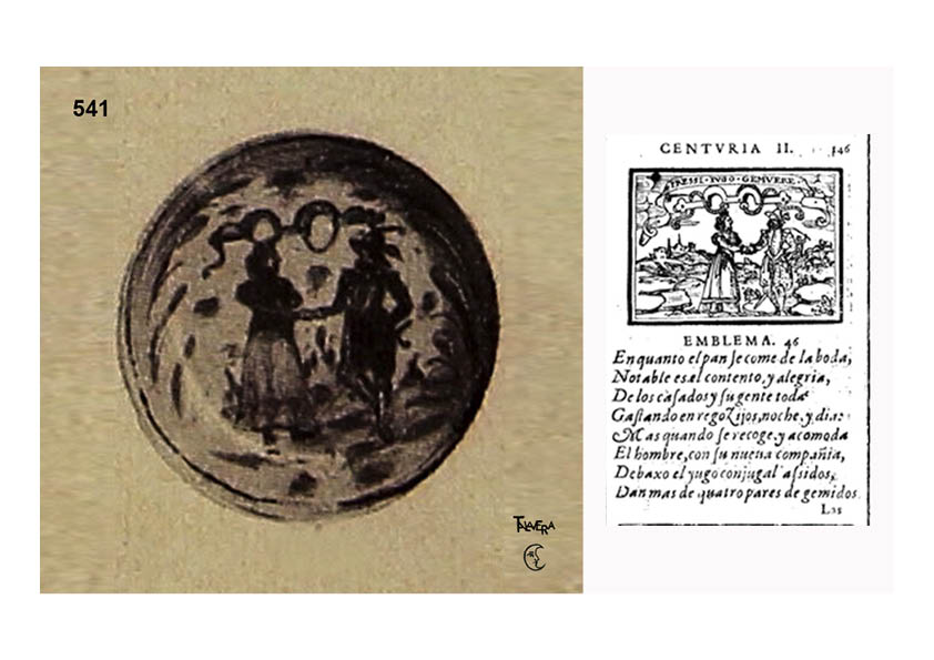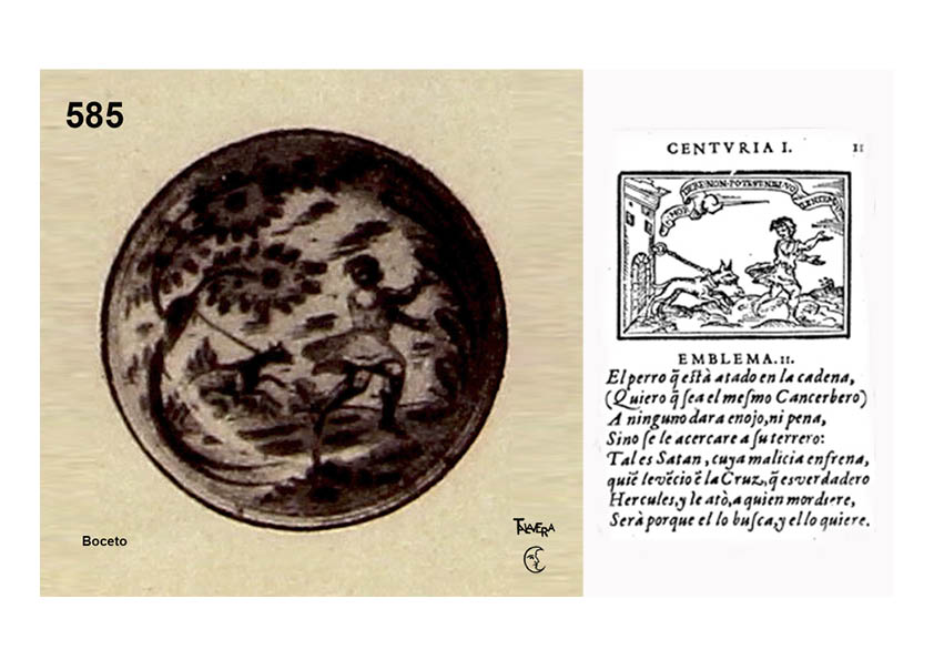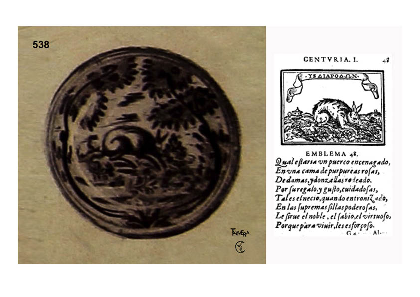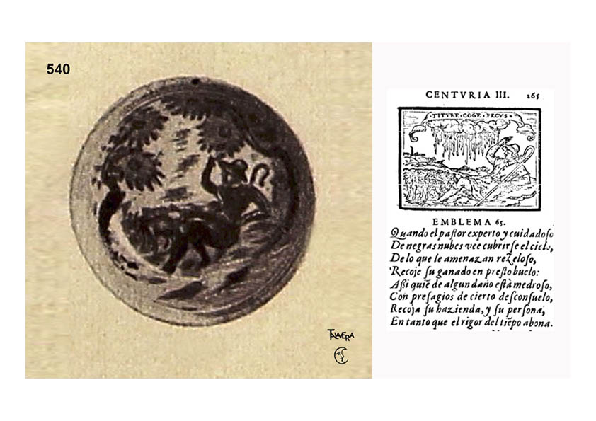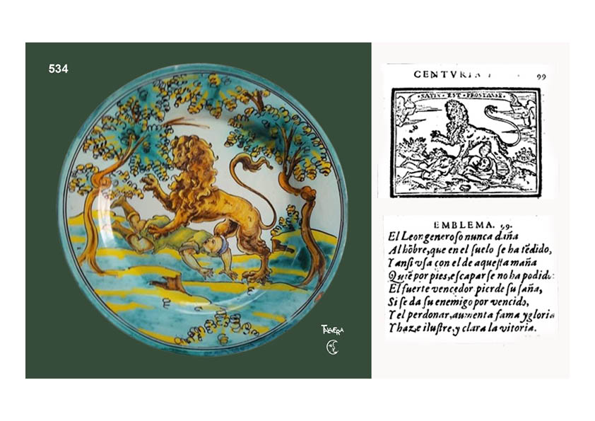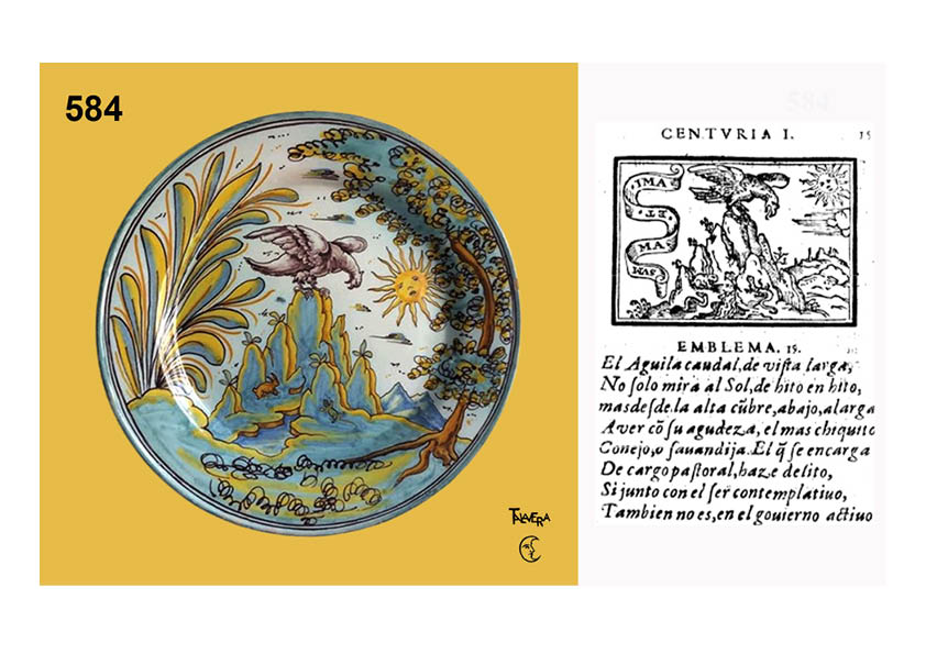 Este otro plato catalogado con el número 584 del 2º catálogo de Ruiz de Luna, representa el Emblema 15 de la CENTURIA I del libro «Los Emblemas Morales de Sebastián de Covarrubias»