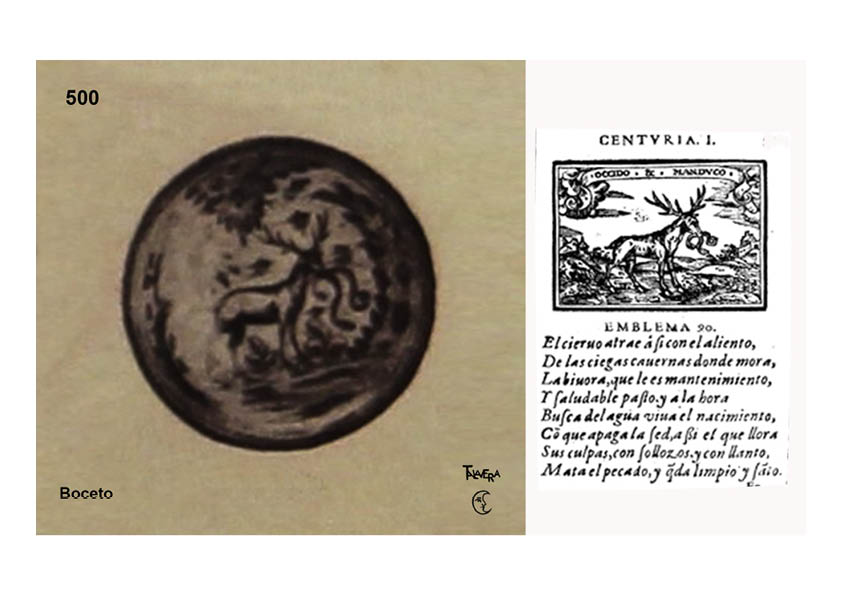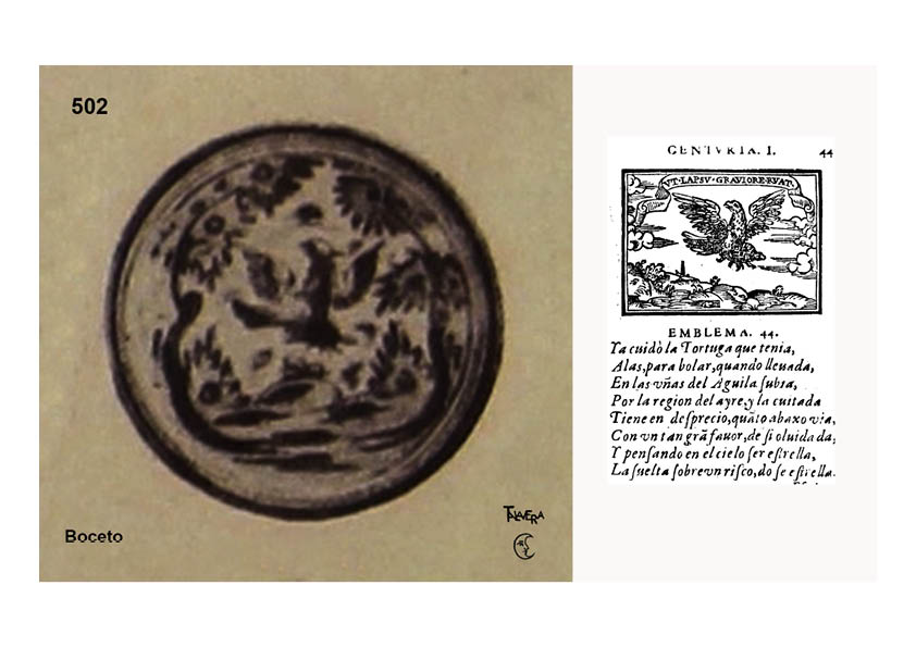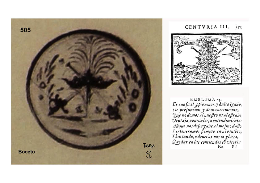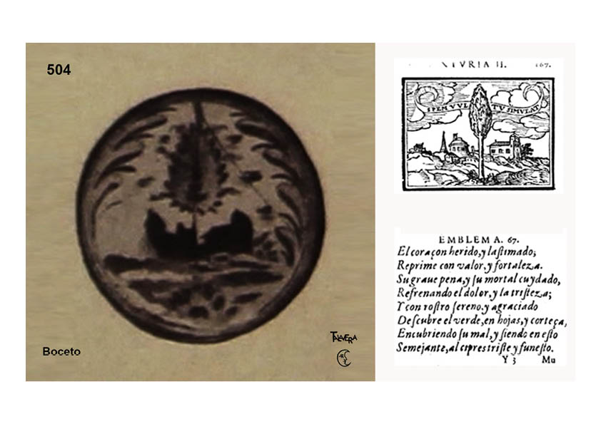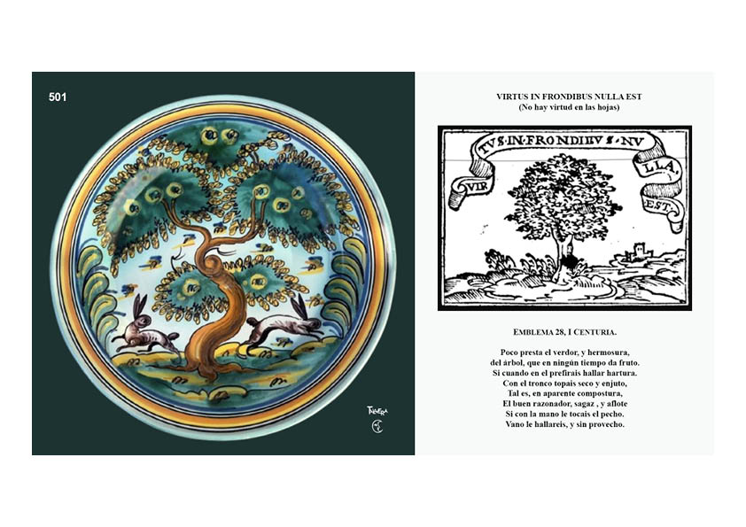 Este otro plato, catalogado con el número 501 del 2º catálogo de Ruiz de Luna, recrea el Emblema 28 de la CENTURIA I del libro «Los Emblemas Morales de Sebastián de Covarrubias»