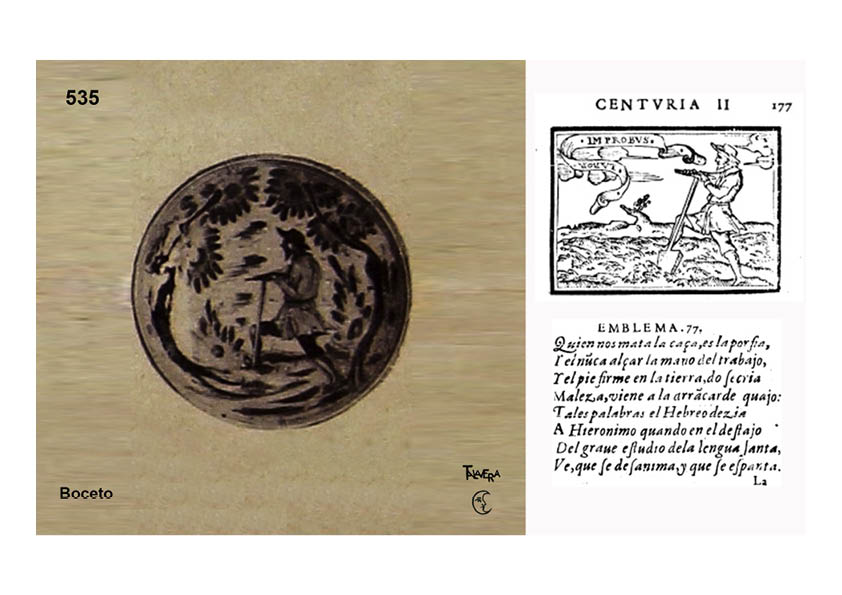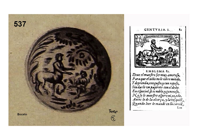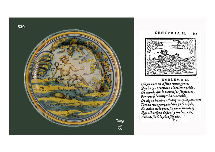 Este otro plato, catalogado con el número 539 del 2º catálogo de Ruiz de Luna, recrea el Emblema 52 de la CENTURIA II del libro «Los Emblemas Morales de Sebastián de Covarrubias»