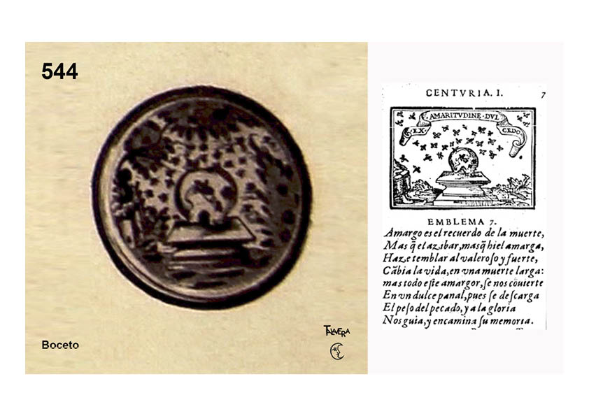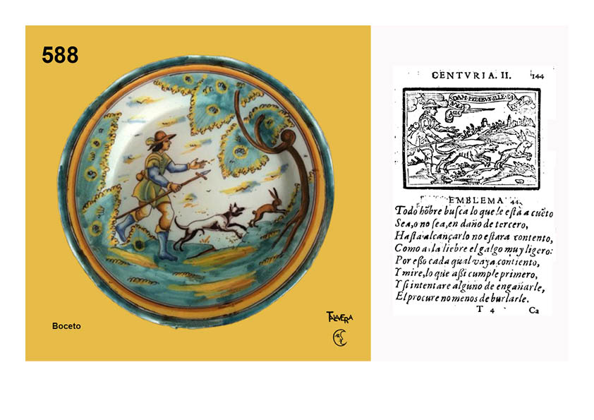 Este otro plato, catalogado con el número 588 del 2º catálogo de Ruiz de Luna, representa el Emblema 44 de la CENTURIA II del libro «Los Emblemas Morales de Sebastián de Covarrubias»