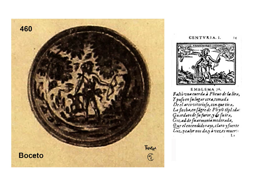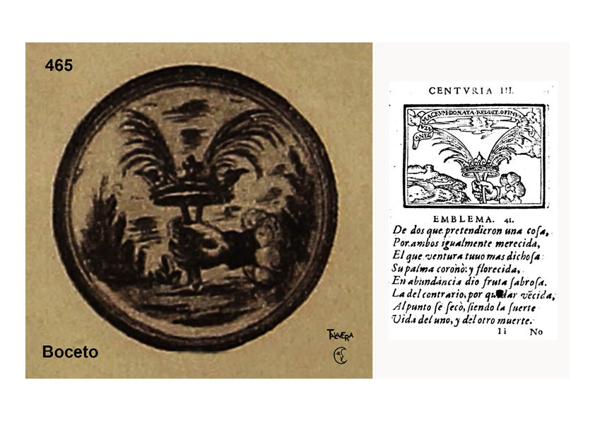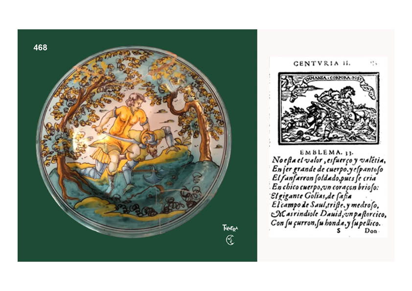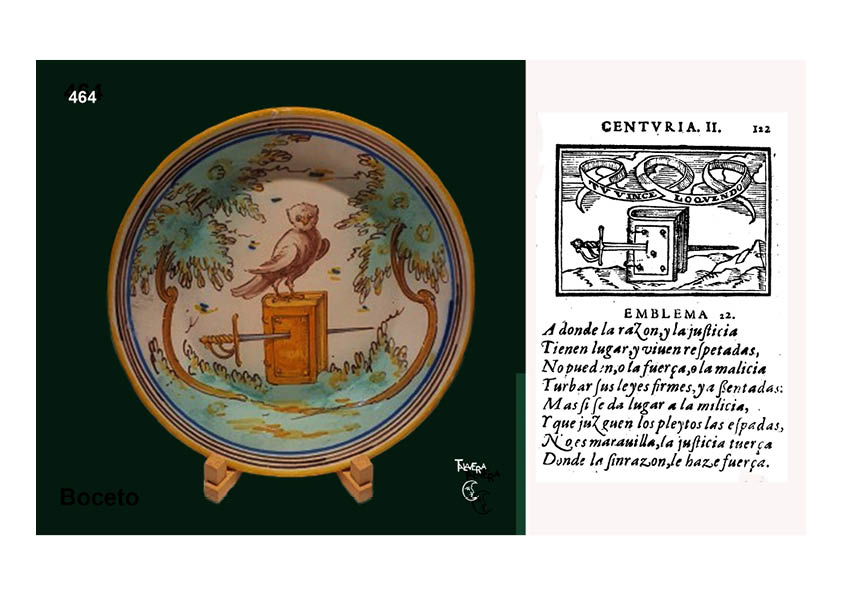Este otro plato, catalogado con el número 468 del 2º catálogo de Ruiz de Luna, recrea el Emblema 13 de la CENTURIA II del libro «Los Emblemas Morales de Sebastián de Covarrubias»