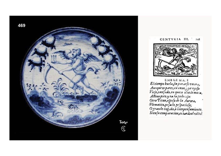 Los Emblemas Morales de Sebastián de Covarrubias en la cerámica de Ruiz de Luna están representados por este plato, catalogado con el número 469 del 2º catálogo de Ruiz de Luna, recrea el Emblema 3 de la CENTURIA III