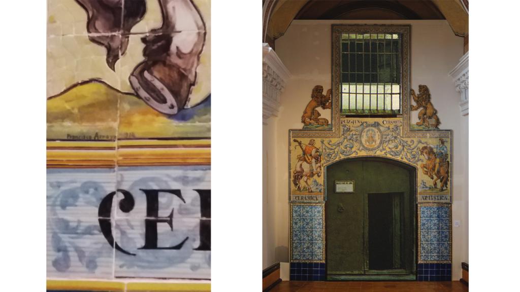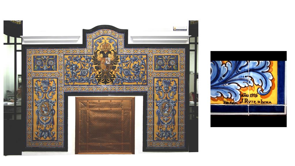En estos murales, el reverso de los azulejos de 14×14 cms. estaba formado por unos círculos concéntricos en relieve, para favorecer el agarre del mortero de unión entre la pared y el azulejo.